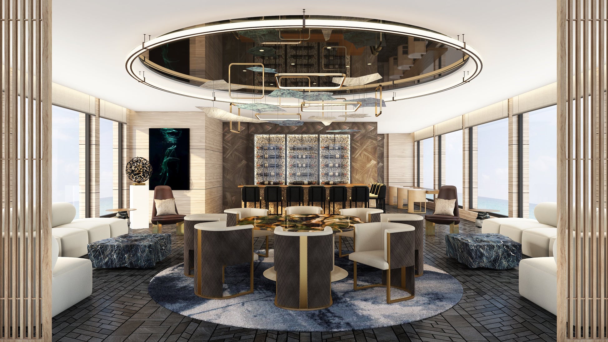 familiar, celebrating the natural light and enhancing Cassius’s habitat throughout the yacht. Cassius, from being able to feel the beauty of stone marquetry surrounded by bamboo materials and all the raw stone.  We believe the greatest source of materials is found in nature’s beauty.
